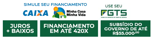 COM O PROGRAMA MINHA, CASA MINHA VIDA VOCÊ PODERÁ TER FINANCIAMENTO PELA CAIXA ECONÔMICA FEDERAL COM JUROS MAIS BAIXOS, SUBSÍDIO DO GOVERNO QUE PERMITE DESCONTAR UM VALOR IMPORTANTE DO IMÓVEL E VOCÊ TAMBÉM PODERÁ COMPLEMENTAR A COMPRA COM SEU FGTS.